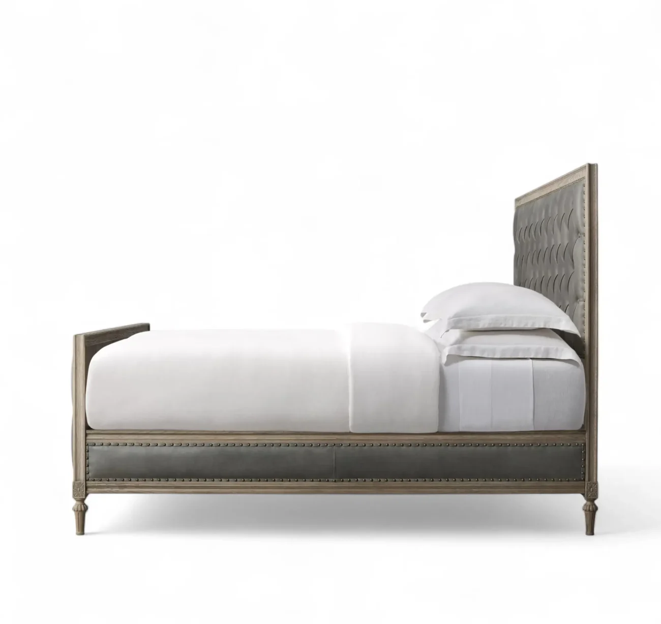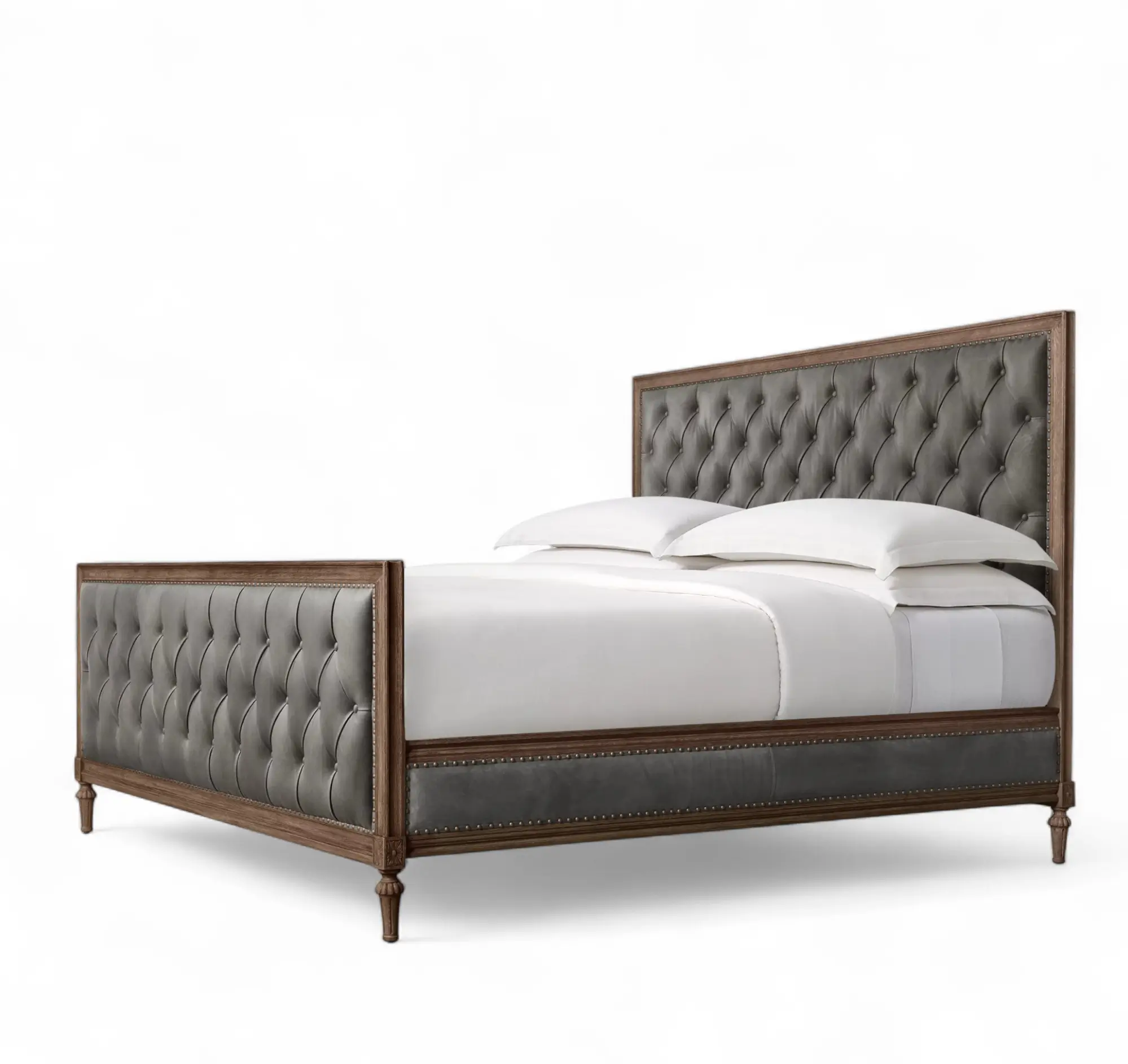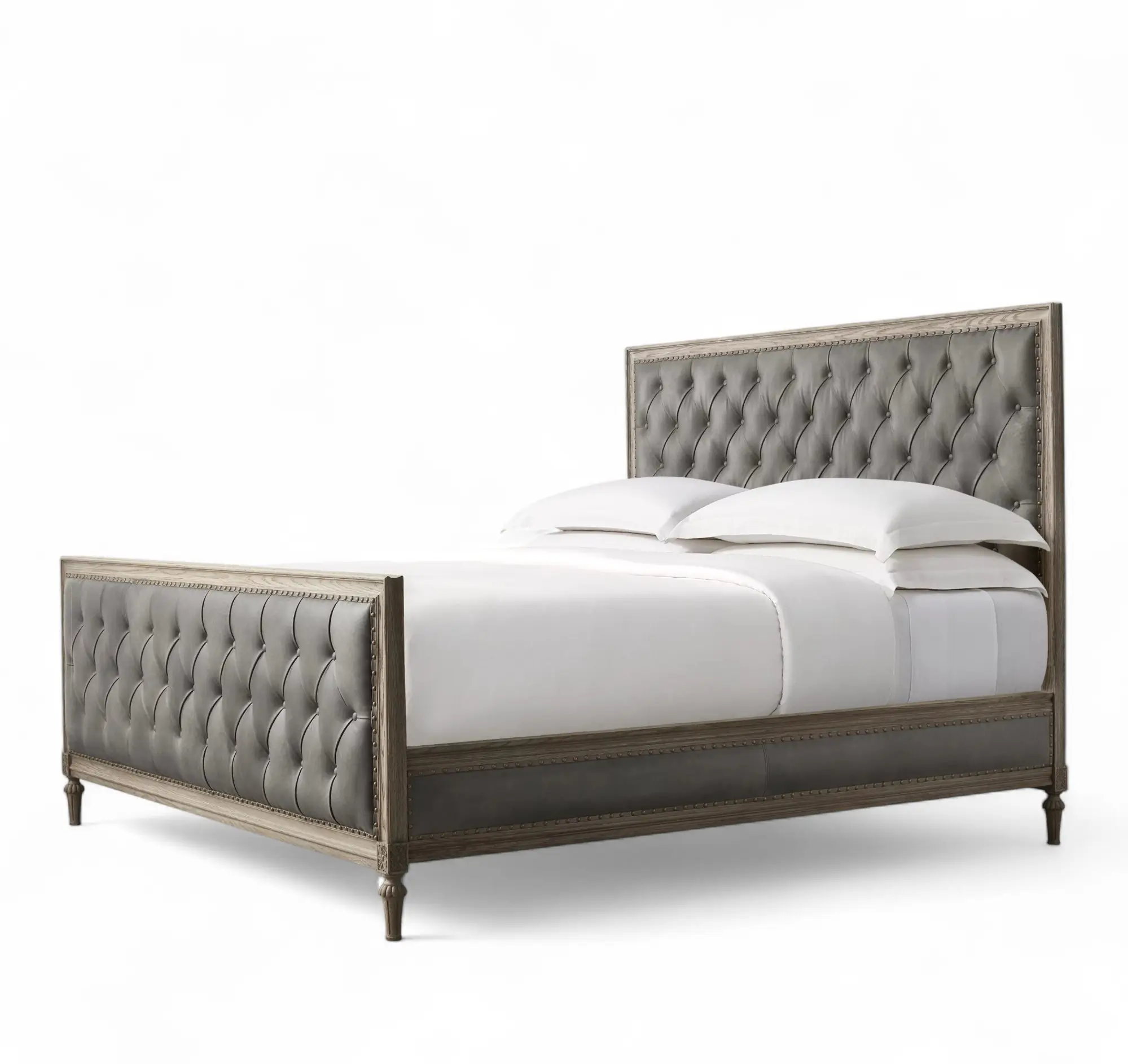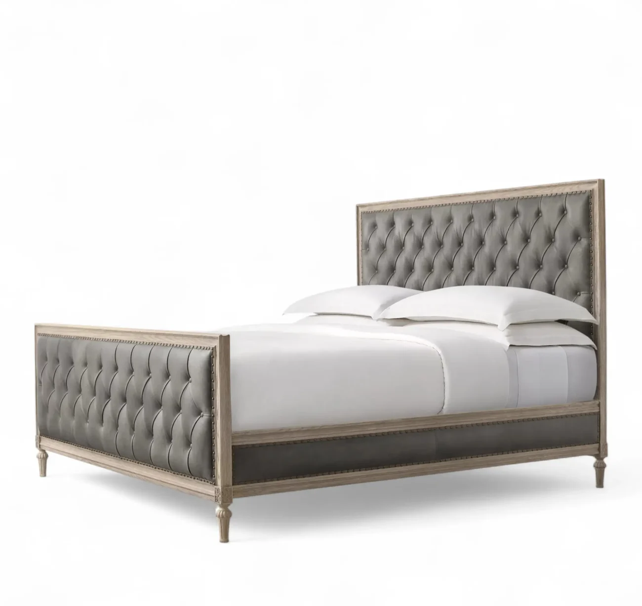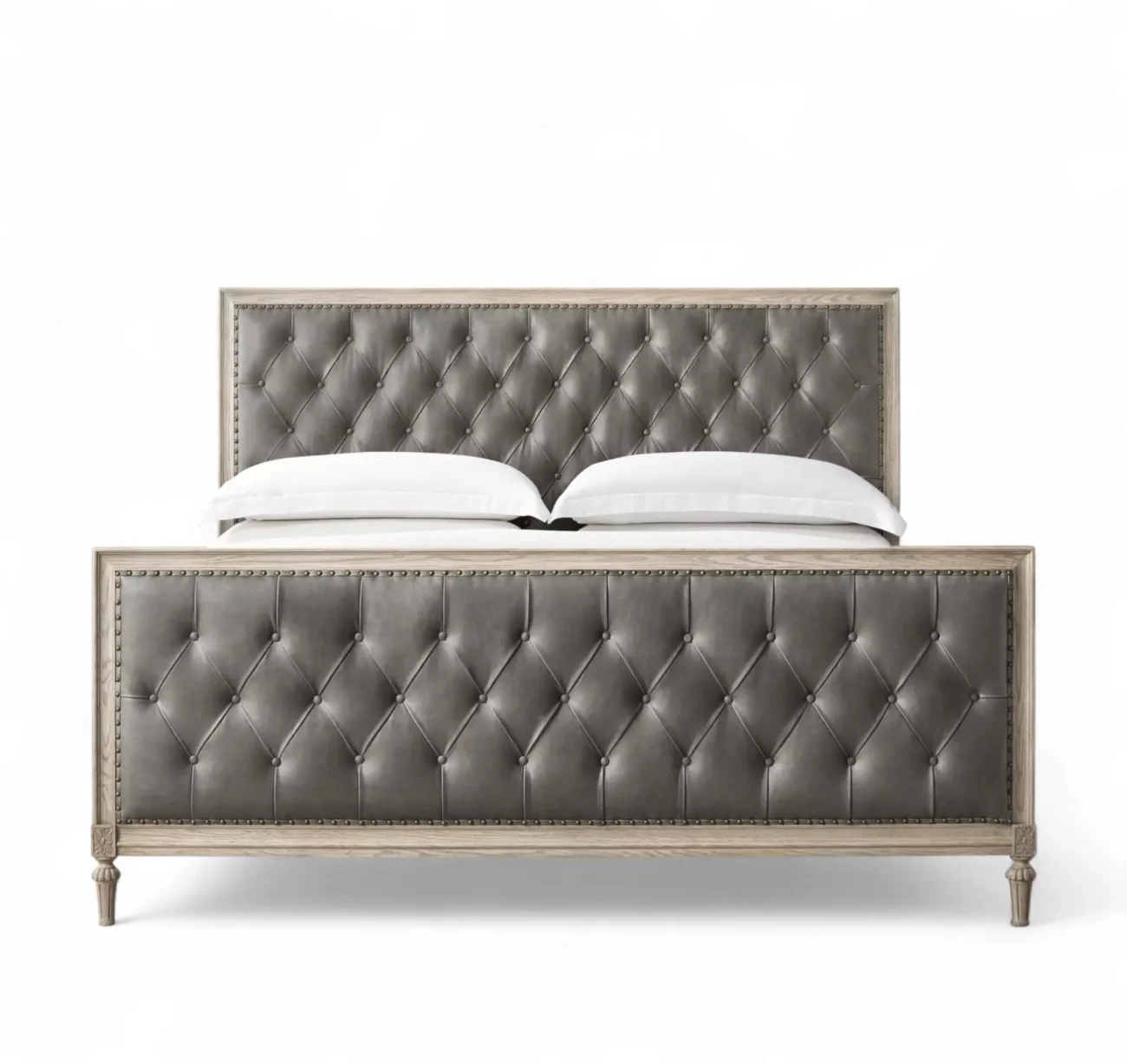 French Leather Diamond-Tufted Panel Bed with Footboard