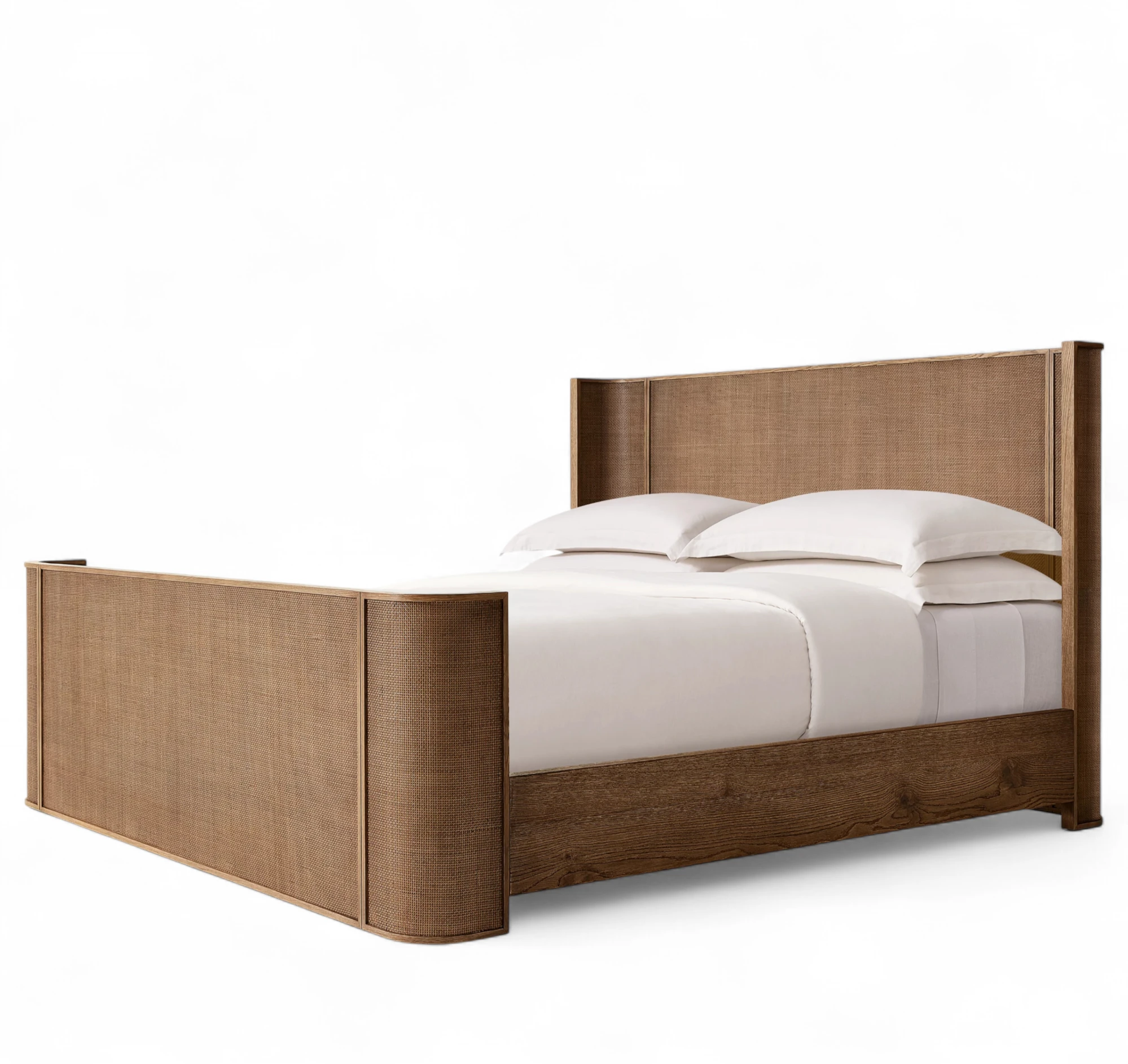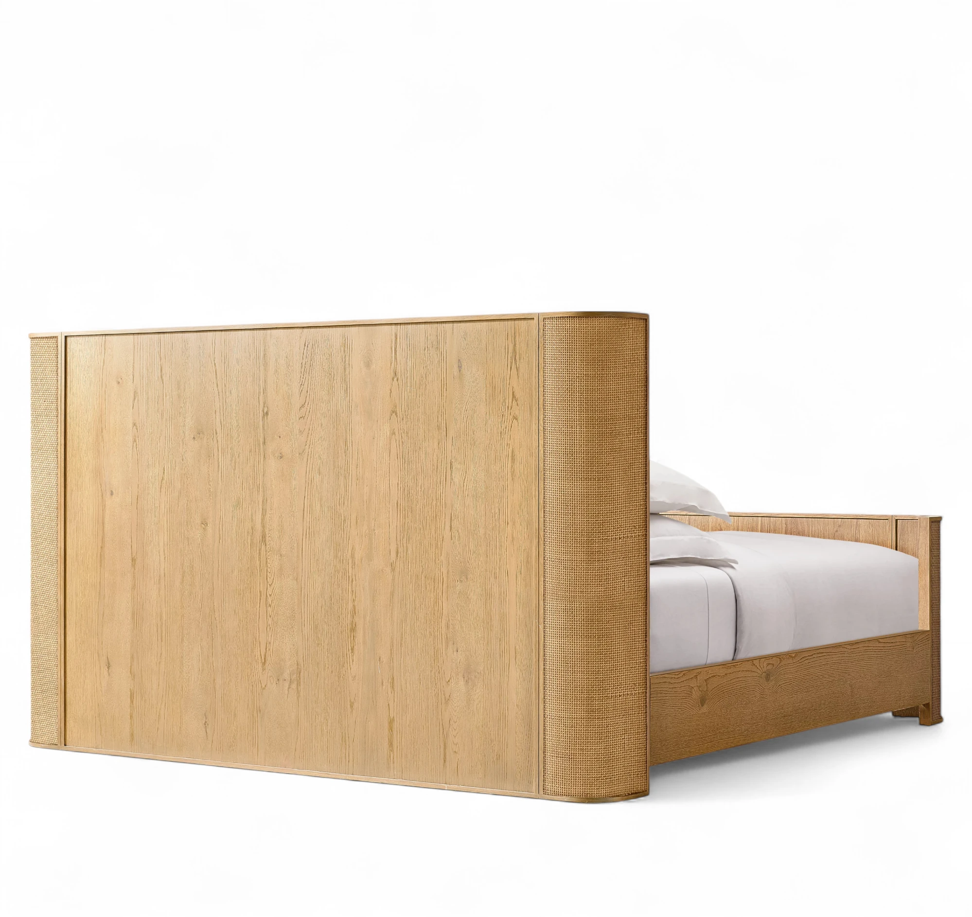 - Headboard is fitted with panels of woven natural cane